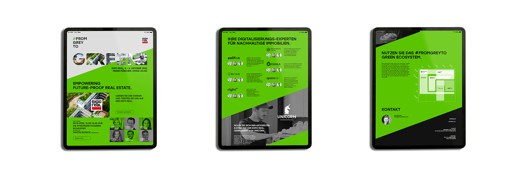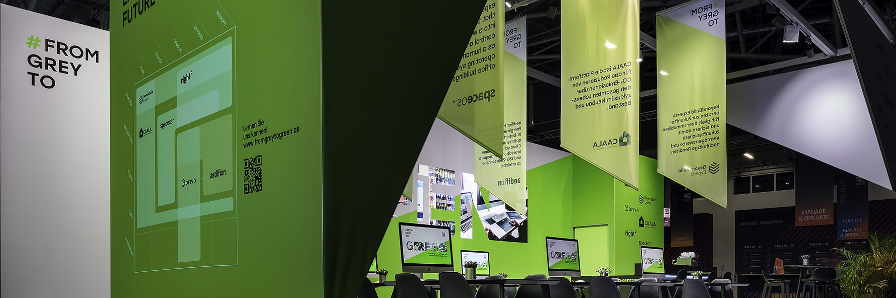 Unter dem Motto #fromgreytogreen präsentierten sechs Proptech- und Climate-Tech-Unternehmen auf der Expo Real München 2022 einen bewusst kontrastierenden Auftritt zur sonst eher konventionellen Messeästhetik. Ziel war es, den Übergang von klassischer, grauer Infrastruktur hin zu nachhaltigen, zukunftsorientierten Technologien sichtbar und erlebbar zu machen.